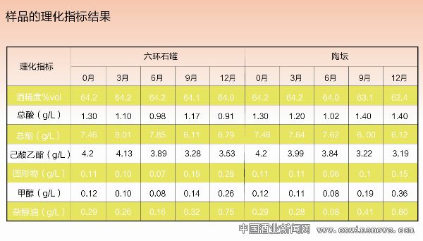 對比兩種容器,貯酒12個月后,六環石罐固形物0.28 g/L,比陶壇高0.13 g/L;甲醇0.26 g/L,比陶壇低0.10 g/L;雜醇油0.75 g/L,比陶壇低0.05 g/L。六環石本身含有較多金屬氧化物成