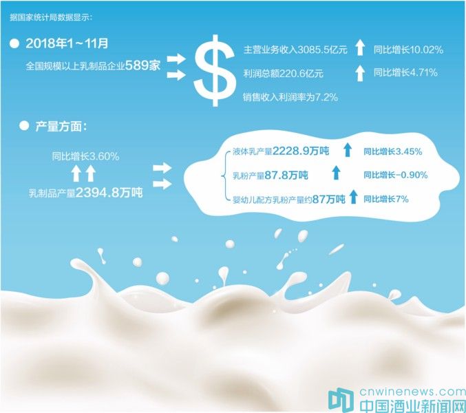 據國家統計局數據顯示,2018年1~11月,全國規模以上乳制品企業589家(2017年610家),主營業務收入3085.5億元,同比增長10.02%(2017年為6.94%),利潤總額220.6億元,同比增長4.71%(2017年為-1.03%),銷售收入利潤率為7.2%(2017年為6.8%);產量方面,乳制品產量2394.8萬噸,同比增長3.60%(2017年為3.91%),其中液體乳產量2228.9萬噸,同比增長3.45%(2017年為4.16%),乳粉產量87.8萬噸,同比增長-0.90%(2017年為-2.35%),嬰幼兒配方乳粉產量約87萬噸,同比增長7%。