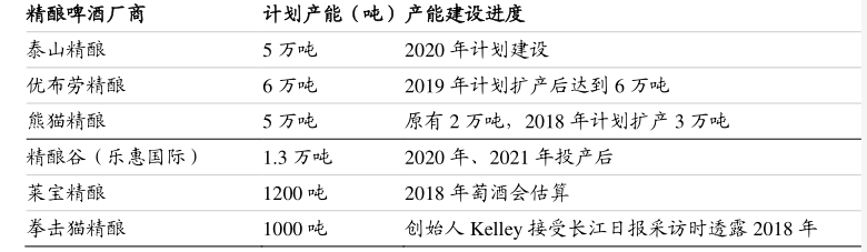 到2025 年中國精釀啤酒消費量有可能達到216萬噸 ,而目前國內精釀啤酒產能仍處于比較低的狀態,主要精釀啤酒品牌產能僅為17.52萬噸,未來產能釋放空間巨大。目前全國約有 5000 家精釀啤酒企業,多數沒有穩定的產能。2021年下半年新籌建或動工的重要啤酒項目多為精釀啤酒工廠。