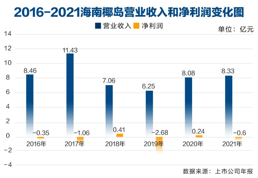 海南椰島已經(jīng)連續(xù)兩年出現(xiàn)虧損,2021年度,海南椰島實(shí)現(xiàn)營(yíng)業(yè)收入8.33億元,同比增長(zhǎng)3.16%;實(shí)現(xiàn)歸屬于上市公司股東的凈利潤(rùn)-6014.09萬(wàn)元,同比由盈轉(zhuǎn)虧。