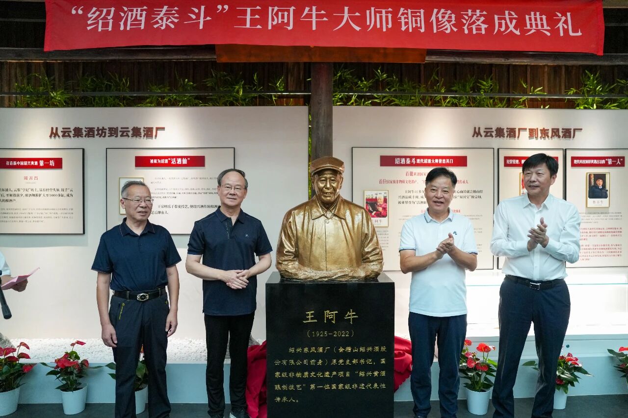 儀式由會稽山黨委書記、副董事長傅祖康主持。紹興市原副市長、紹興市黃酒行業協會會長徐明光,紹興市非物質文化遺產保護協會會長何俊杰,精工控股集團董事長、會稽山董事長方朝陽,與大師后人代表王新潮共同為銅像揭幕。揭幕禮成,這座銅像不僅是對大師百年人生的崇高致敬,更是紹興黃酒人心中一座不滅的“匠心燈塔”。