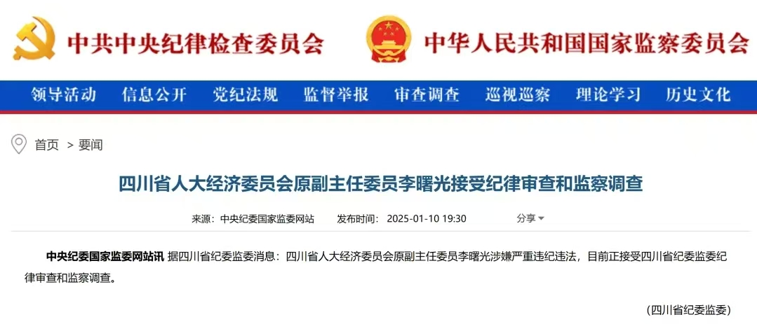 1月10日,據(jù)四川省紀(jì)委監(jiān)委消息,四川省人大經(jīng)濟(jì)委員會原副主任委員李曙光涉嫌嚴(yán)重違紀(jì)違法,目前正接受四川省紀(jì)委監(jiān)委紀(jì)律審查和監(jiān)察調(diào)查。